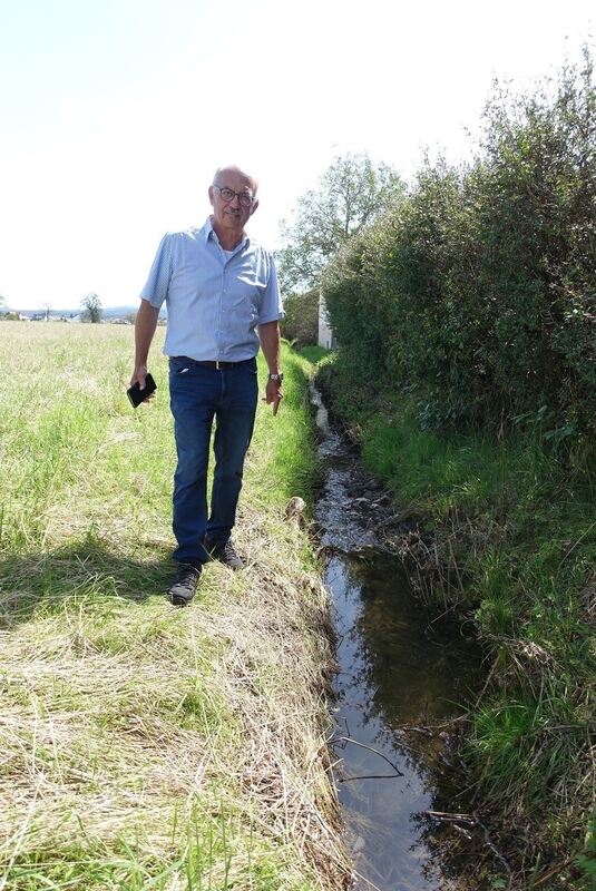 Roland Bengel zeigt auf den Graben, der bei Starkregen das Wasser aufnehmen soll. Etwas weiter hinten macht der Graben eine 90-Grad-Kurve nach rechts in Richtung Ort. FOTO: DÖRR