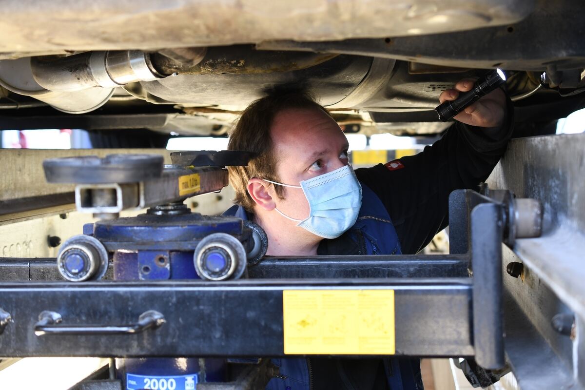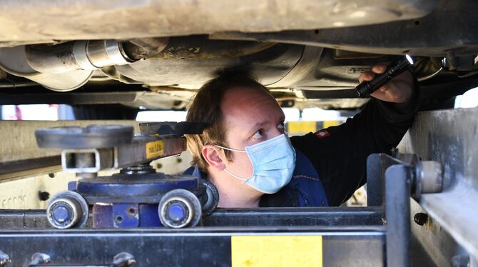 Nicht nur der Mundschutz verrät, dass der Sachverständige Stefan Klahs während der Pandemie eine Hauptuntersuchung in Reutlingen macht. Der Kunde darf ihm dabei nicht mehr zuschauen, sondern muss Abstand halten.