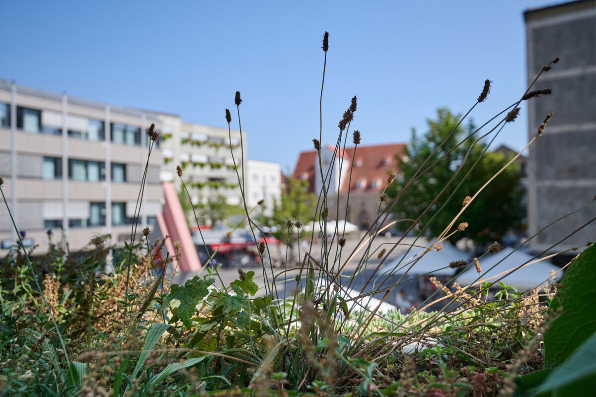 REUTLINGEN. »Biosphärenstadt« schön und gut – die aktuelle Optik des Reutlinger Rathauses ist kaum geeignet, sich als Marke oder gar Instagram-Hotspot zu etablieren. Noch weniger dürfte der dem Prinzip »vom Winde verweht« geschuldete Wildblumenschmuck den Geschmack der archetypischen schwäbischen Hausfrau treffen. Spitzwegerich und Kamille sowie anderes gern als »Unkraut« verunglimpfte Gewächs scheint dort Victor Hugos »Glöckner« gleich um Wasser zu flehen. Dabei betrifft dies keine vernachlässigenswerte Hinterhofecke, sondern eine exponierte Lage.