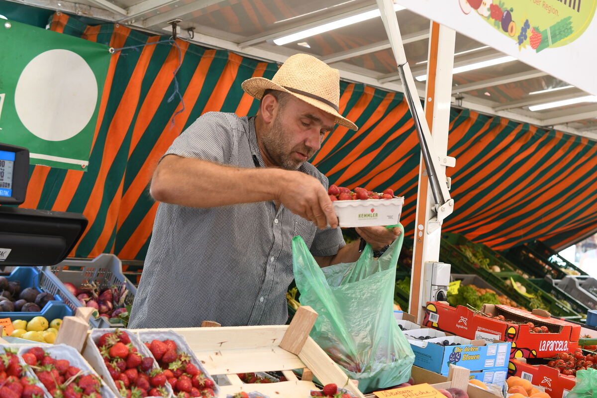 Typische Szene: Weil es die Kundin wünscht, stapelt Markthändler Frank Kuhn bereits in Pappschalen verpackte Erdbeeren noch zusätzlich in eine Plastiktüte. Dabei könnte die Dame die Beeren auch in ihren Korb stellen.