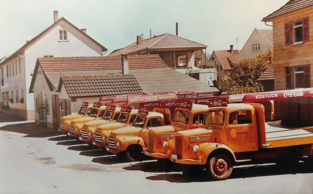 Mit diesen umlackierten, ehemaligen Militärlastwagen wurde die Cola ausgefahren.