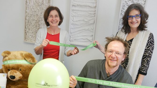 Bruno der Bär weist mit seinem grünen Kopfband auf den »Tag der Kinderhospizarbeit« hin. Dahinter (von links): Silvia Ulbrich-Bierig, Rita Leonard und Dietmar Stooß. FOTO: LEISTER