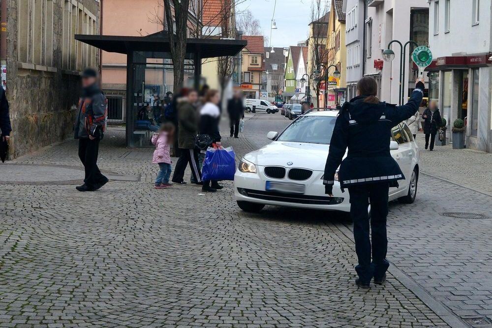Einsatzgebiet Altstadt: Eine Mitarbeiterin des Kommunalen Ordnungsdienstes stoppt auf der Metzgerstraße einen der zahlreichen Autofahrer, die das Durchfahrtsverbot ignorieren. ARCHIVFOTO: NIETHAMMER