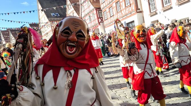 Partystimmung in Reutlingen: 3.500 Hästräger aus mehr als 90 Gruppen sorgen am 2. Februar mit einem großen Umzug für eine farbenfrohe Straßenfasnet in der Altstadt und locken rund 15.000 Zuschauer – ein Rekord. Viele Gruppen kommen aus der nächsten Umgebung, Zünfte aus dem Landkreis gibt es zuhauf. Aber viele Vereine und Zünfte nehmen sogar eine lange Anreise in Kauf genommen, um Teil des Umzugs zu sein, der vom Reutlinger Männerverein organisiert wird. Zur Bildergalerie