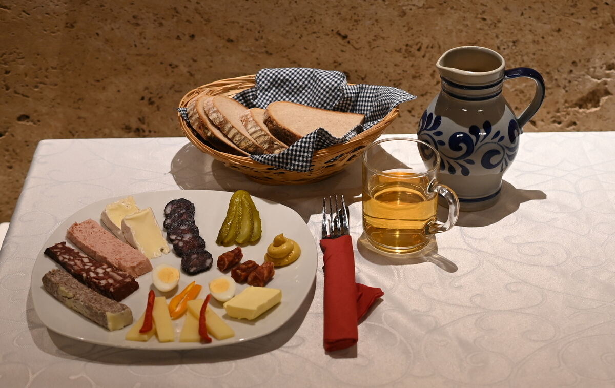Hier wird in einer Besenwirtschaft zum Most ein Vesperteller mit Wurst von der eigenen Sau serviert.