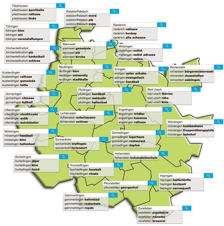 Wer in die weiß schimmernde Suchzeile der Google-Maske das Stichwort »Reutlingen« eingibt, bekommt bereits nach wenigen Buchstaben weitere Wort-Kombinationen angezeigt. Google weiß, was andere Nutzer unter dem Begriff gesucht haben. Und rät, was wir mit unserer Suche meinen könnten. »Automatische Vervollständigung« nennt das die größte Suchmaschine der Welt. Eine Momentaufnahme der Assoziationen aus dem Internet.