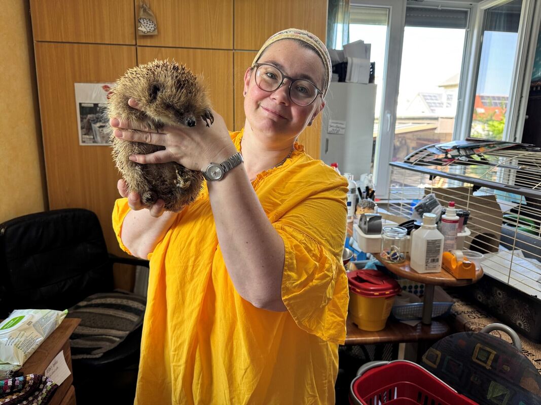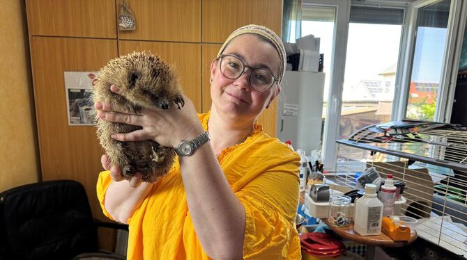 Melanie Bauer mit einem Igel in der Igelstation in Riederich.