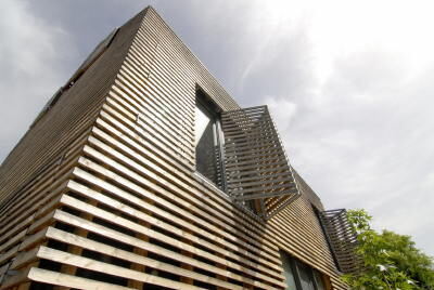 Neue Architektur: Holzverkleidete Fassade mit Faltschiebe-Elementen am Haus Eichler in Pfullingen.