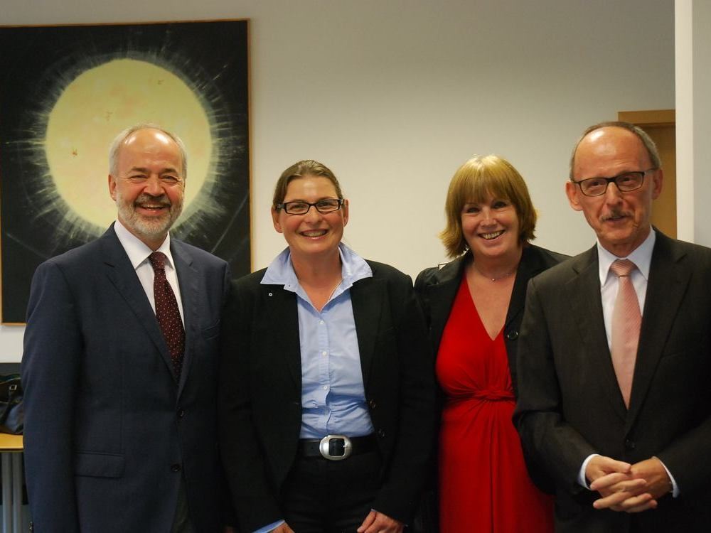 »Die Opferhilfe ist im Landkreis kompetent vertreten«, sagte Landrat Thomas Reumann (links) bei der Amtseinsetzung der neuen Außenstellenleiterin des Weißen Rings, Andrea Sautter (Zweite von links). Daneben die Anwältin Meta Lindenbach und Erwin Hetger, Landespolizeipräsident a. D. FOTO: STEIDLE