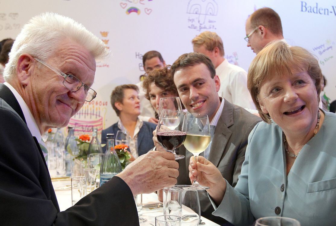 Der Ministerpräsident von Baden-Württemberg, Winfried Kretschmann (Grüne), sein Finanzminister Nils Schmid (SPD) und Bundeskanzlerin Angela Merkel (CDU, v.l.) stoßen auf der Stallwächter-Party, dem Sommerfest des Landes Baden-Württemberg in Berlin, mit Wein an. Auch auf dem Reutlinger Weindorf hat sich unsere Angie einmal blicken lassen. FOTO: DPA