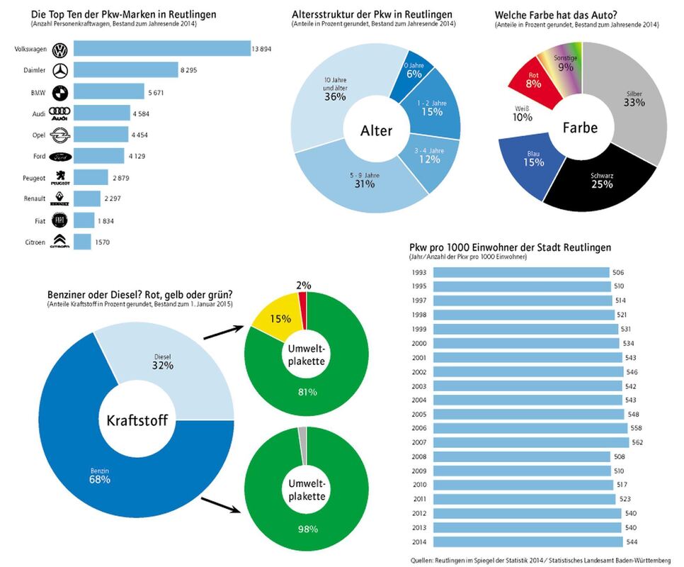 REUTLINGEN. Die begehrteste Automarke in der Stadt Reutlingen ist? Volkswagen. An zweiter Stelle fährt »man«: Daimler. In der benachbarten Landeshauptstadt Stuttgart ist das genau umgekehrt – hier haben Fahrzeuge mit dem Stern den höheren Marktanteil vor VW. Was die beiden Städte gemeinsam haben: die bei den stolzen Pkw-Besitzern mit Abstand beliebteste Autofarbe. Das ist Silber/Grau. Das geht aus den statistischen Veröffentlichungen der Städte Reutlingen und Stuttgart über die Fahrzeugbestände zum Jahreswechsel 2014/2015 sowie des Statistischen Landesamtes Baden-Württemberg hervor.