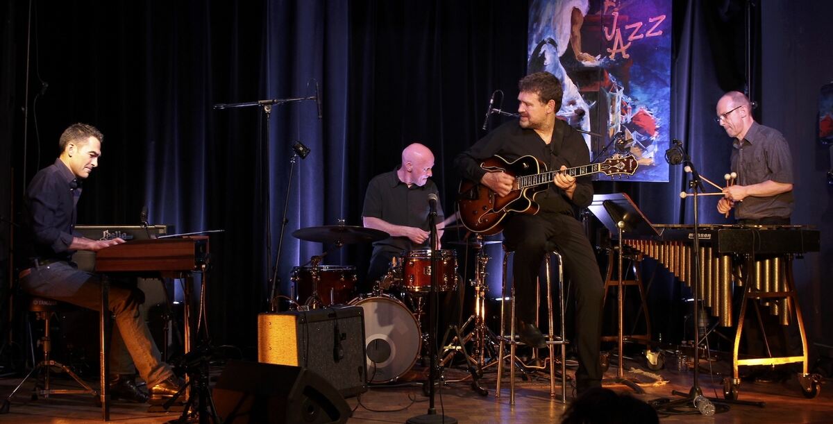 Jean-Philippe Bordier Quartett. In der Besetzung mit Orgel, Gitarre, Vibraphon und Schlagzeug präsentiert der Pariser Gitarrist am Sonntag, 24. März, 12.30 Uhr, im Pappelgarten Eigenkompositionen, die sich stilistisch aus der Tradition eines Wes Montgomery und George Benson speisen.