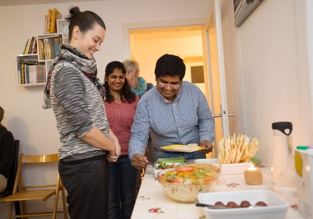 Karthickraja Ponnuswamy und Sumathi Durasamy (von rechts) haben für ihre Gäste typisch indische Gerichte zubereitet.