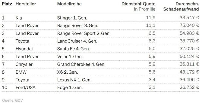 Grund für die vielen Taten sind laut Polizei die schnellen Autobahnverbindungen nach Osteuropa. Dorthin verschwinden viele Wagen, um ganz oder in Teile zerlegt verkauft zu werden. Der KfZ-Diebstahl wird laut Polizei von spezialisierten Banden aus Osteuropa dominiert. Die Autodiebe stahlen am häufigsten SUVs, also große und teure Geländewagen. Neun der zehn am häufigsten gestohlenen Modellreihen waren SUVs, darunter drei Modelle von Land Rover.