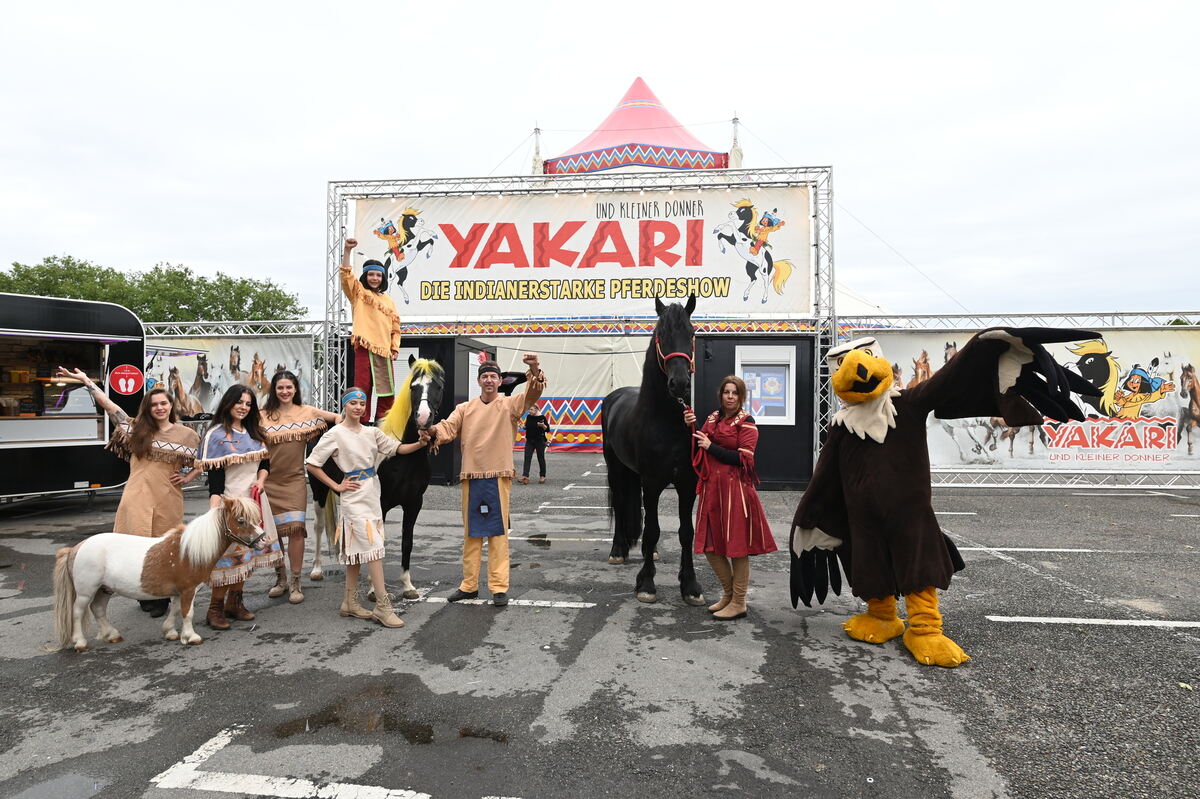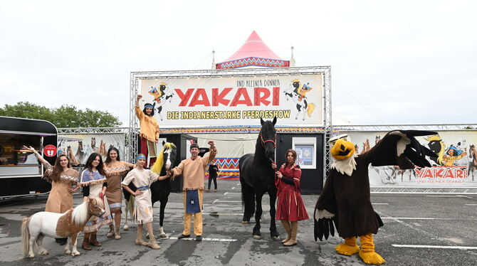 Ein Teil der Künstler der Pferdeshow »Yakari und kleiner Donner« vor ihrem Zelt auf dem Reutlinger Bösmannsäcker.