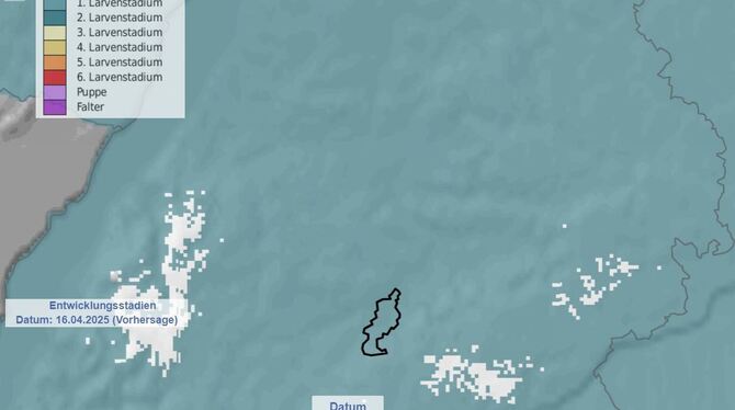 Die Vorhersage ist für eine knappe Woche im Voraus abrufbar. Für die Karwoche zeigt die Karte eine nahezu flächendeckende Ausbreitung der Tiere im gesamten Kreis Reutlingen, genauso wie in den umliegenden Landkreisen Tübingen, Esslingen, Sigmaringen sowie im Alb-Donau-Kreis und im Zollernalbkreis.