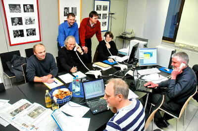 Fachleute am GEA-Telefon: (von links, vorn) Hans Bogenschütz (TÜV) und Uwe Falke (Dekra), ihnen gegenüber Ralf Beck, Roland Frick und Sigrid Dummann (alle Landratsamt), stehend Mark Gutmann und Peter Kurr (Autohäuser Gutmann und Schänzlin).
