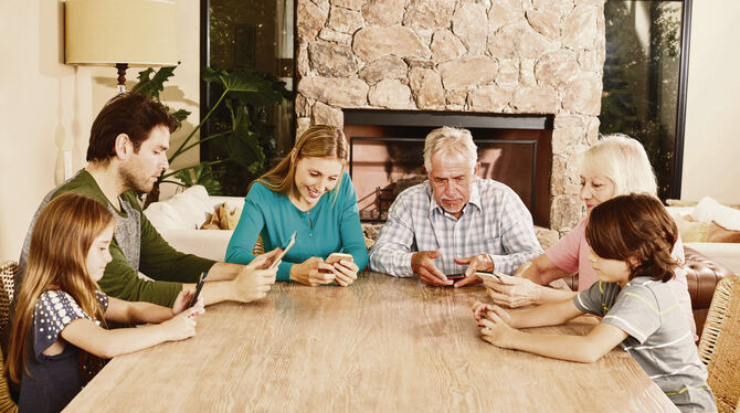 Großfamilie beim Spielen und Surfen mit Tablet und Smartphone zusammen am Tisch.