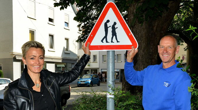 Auch Elternbeirat und Förderverein des List-Gymnasiums sind begeistert vom Aluminum-Dreieck. Gemeinsam haben sie mit einem Grafiker einen-Smombie-Aufkleber entworfen, der vielleicht schon bald in der Tourist-Information am Marktplatz verkauft werden soll. (GEA)