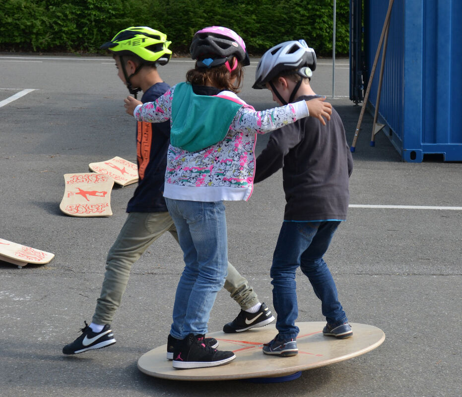 Gemeinsam sind sie stark: Die Kinder versuchen, sich auf dem Wackelbrett zu halten.