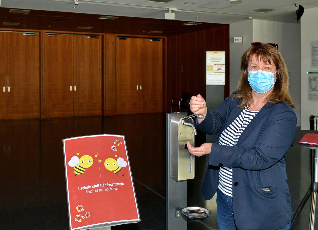 Lächeln geht auch mit Maske: Stadthallen-Chefin Petra Roser mit Desinfektionsmittelspender und Bienen-Tafel. FOTOS: NIETHAMMER