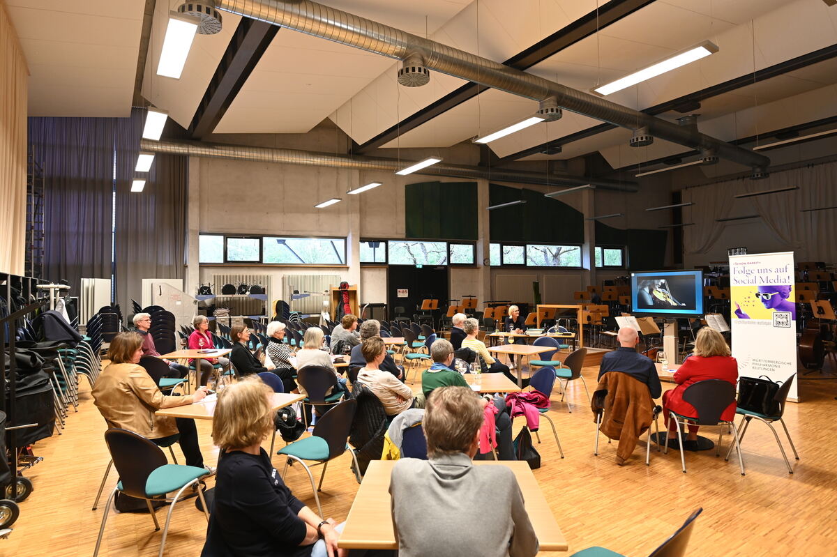 So sieht die Erlebniswelt Orchester beim Kurs »Mein erstes Mal« aus: Gemütlich im Probenraum der Württembergischen Philharmonie sitzen und sich klassische Musik sowie die Geheimnisse eines Sinfonieorchesters erklären lassen.