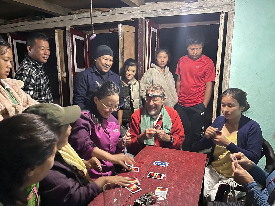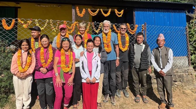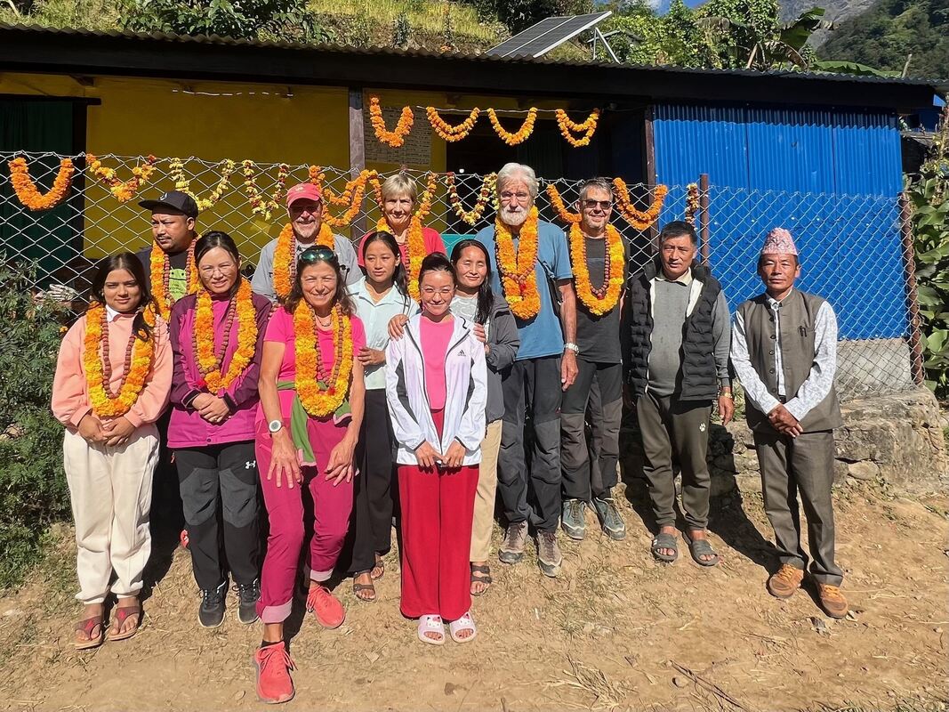 Der Empfang in den Dörfern in Nepal war für das ärztliche Hilfsteam sehr herzlich, Rainer Claußnitzer (in der hinteren Reihe 2. von links, daneben) Martina Negwer, Volkhard Wenzel und Bernhard Negwer.