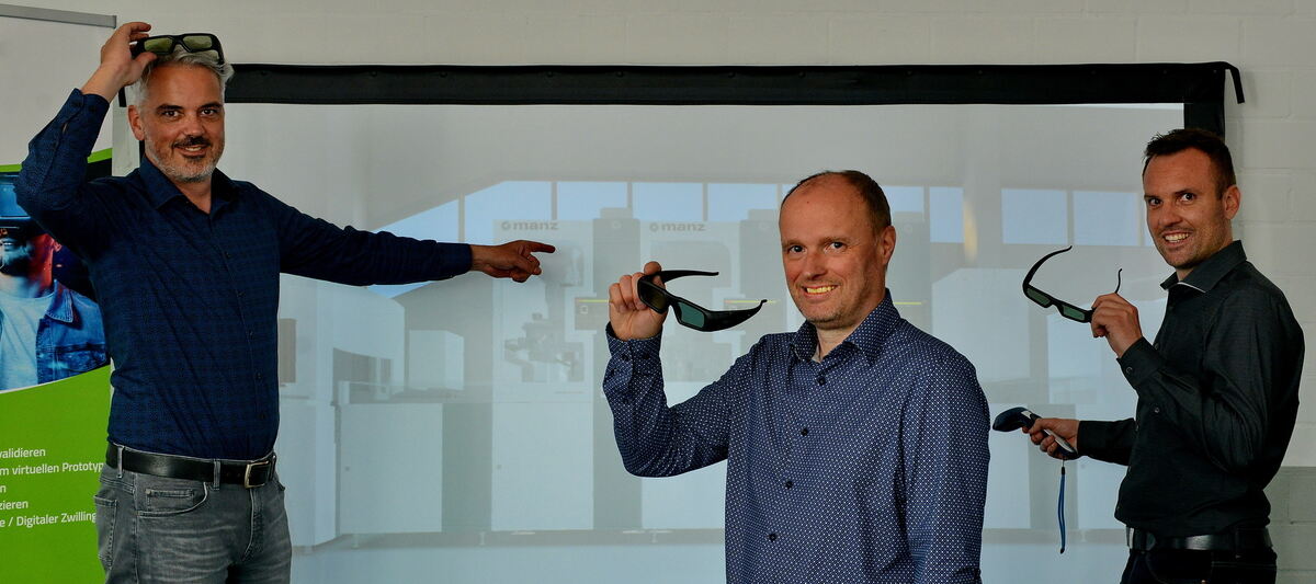 So präsentiert Manz seine Maschinen: 3-D-Brillen in den Händen von Axel Bartmann (links), Stephan Lausterer (Mitte) und Max Hirlinger.