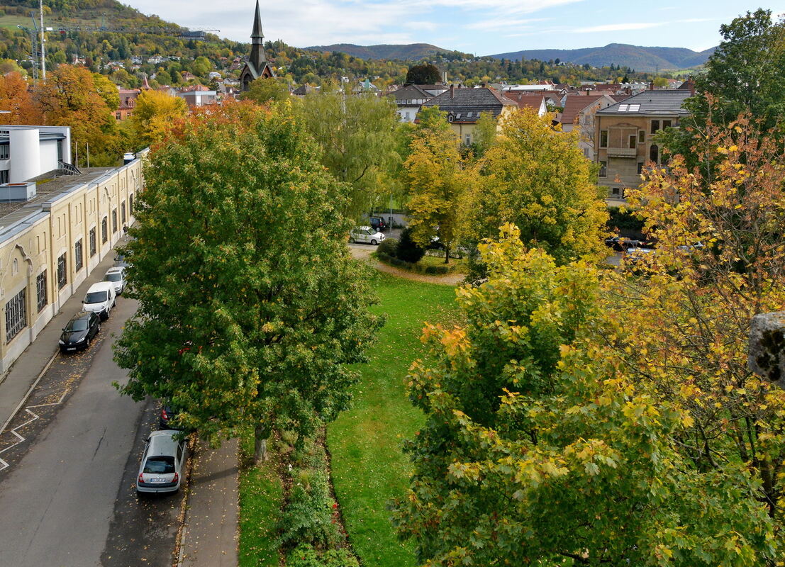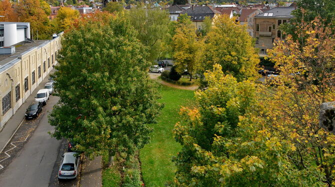 In allen Entwürfen der Planungsbüros, die beim städtebaulichen Ideenwettbewerb mitgemacht haben, war eine Überbauung des Parks zwischen Finanzamt (links, im Hintergrund die Leonhardskirche) und Hallenbad vorgesehen.Foto: Niethammer