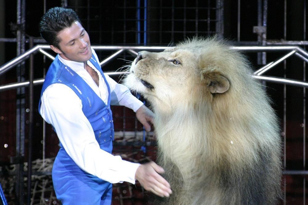 Alexander Lacey mit Massai, dem mächtigen und 350 Kilo schweren »Lion King« aus seiner gemischten Raubtiergruppe. FOTO: PR