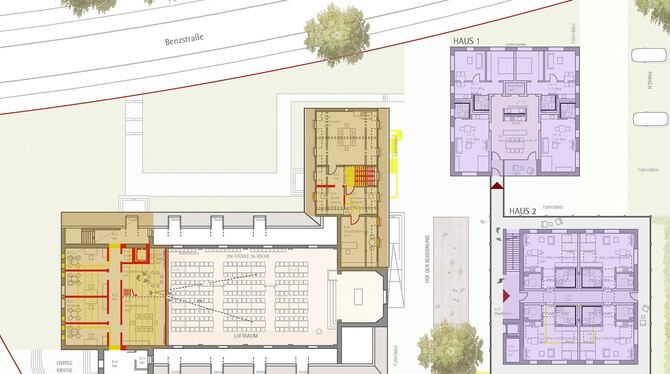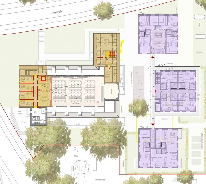 So sollen die drei Häuser, die beim Diakonischen Zentrum Christuskirche entstehen, von Westen her aussehen: links an der Benzstraße Haus 1 mit Clusterwohnungen, in der Mitte Haus 2 als »Hof der Begegnung« und rechts Haus 3 mit separaten Wohnungen.