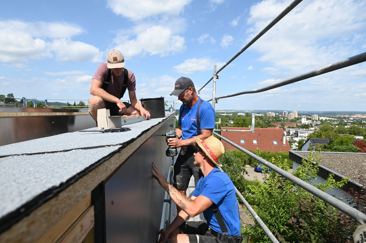 Hoch über Reutlingen sind Dachdecker extremen Temperaturen fast schutzlos ausgesetzt. Wenn dann noch Dachpappe mit einem Gasbrenner verschweißt werden muss, kommt die Hitze von oben und unten.