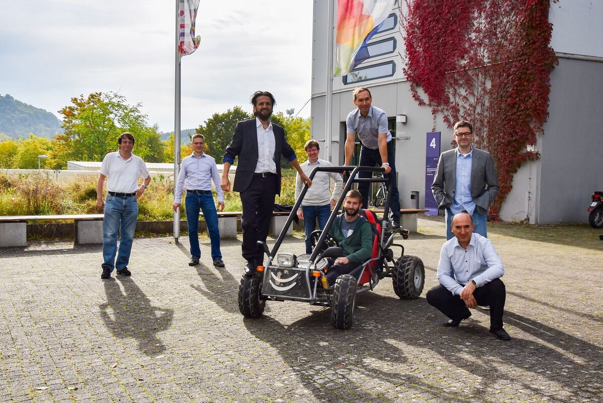 Der Straßenbuggy Adly GK 125 wird zum eFahrzeug umgebaut. Diese Professoren des Studiengangs Mechatronik zeigen, wie man Lehre und Praxis an der Hochschule verbindet (von links): Prof. Dr. Eberhard Binder, Prof. Dr. Carsten Raudzis, Prof. Dr. Christian Höfert, Prof. Dr. Jens Weiland, Prof. Dr. Ertugrul Sönmez. Auf dem Buggy: Prof. Dr. Matthias Rätsch, Prof. Dr. Gernot Schullerus, sitzend: Tim Aaron Möck. FOTO: TEC-PR/EMMA KINDERMANN