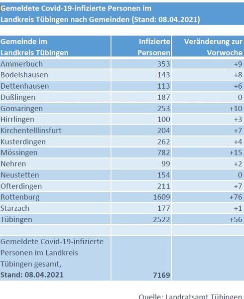 18:05 Uhr Das Tübinger Landratsamt meldet für heute 30 neue Corona-Fälle. Damit steigt die Zahl der Erkrankungen mit Covid-19 im Landkreis Tübingen seit Beginn der Pandemie auf 7.263. Bei den Neuinfektionen handelt es sich sowohl um neue Einzelfälle als auch um Kontaktpersonen bereits bekannter Fälle sowie um familiäre Häufungen. Die 7-Tages-Inzidenz pro 100.000 Einwohner im Kreis Tübingen steigt nach Angaben des Landesgesundheitsamtes auf 114,1. Die Zahl der Todesfälle in Zusammenhang mit dem Coronavirus bleibt bei 168. Angaben über die Zahl der Genesenen macht das Landratsamt jeden Freitag. (pm)