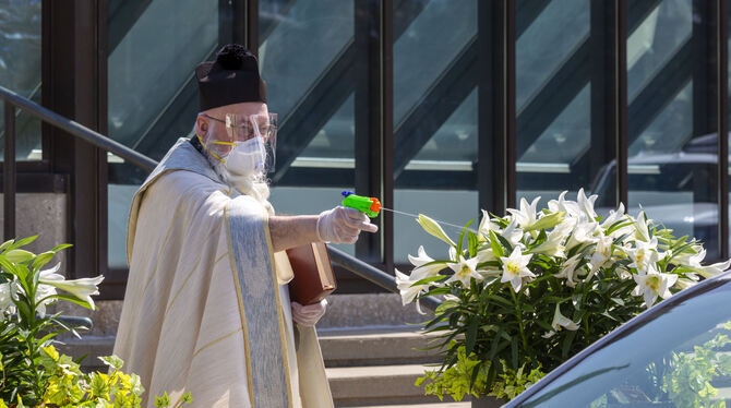 11:48 Uhr Das Coronavirus zwingt zu außergewöhnlichen Maßnahmen: Ein katholischer Pfarrer hat im US-Bundesstaat Michigan zur Spritzpistole gegriffen, um trotz der Pandemie Osterkörbe von Gemeindemitgliedern zu segnen. Die Gläubigen konnten am Samstag mit ihren Autos vor die Kirche St. Ambrose in der Stadt Grosse Pointe Park bei Detroit fahren, wo der Geistliche Timothy Pelc sie mit Mundmaske, Gesichtsschutz und Handschuhen empfing. Dann spritzte der Pfarrer das Weihwasser aus sicherer Distanz auf die Osterkörbe in den Autos. »Ich liebe, wie Sie unsere Traditionen an diese Zeit anpassen!!!«, schrieb eine Nutzerin auf Facebook, wo sich mehrere andere für die Aktion bedankten. (dpa)