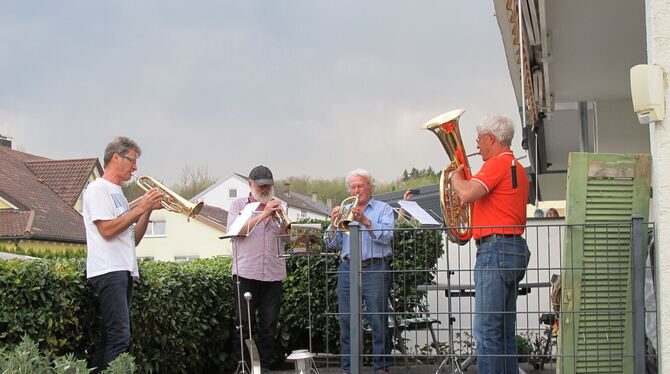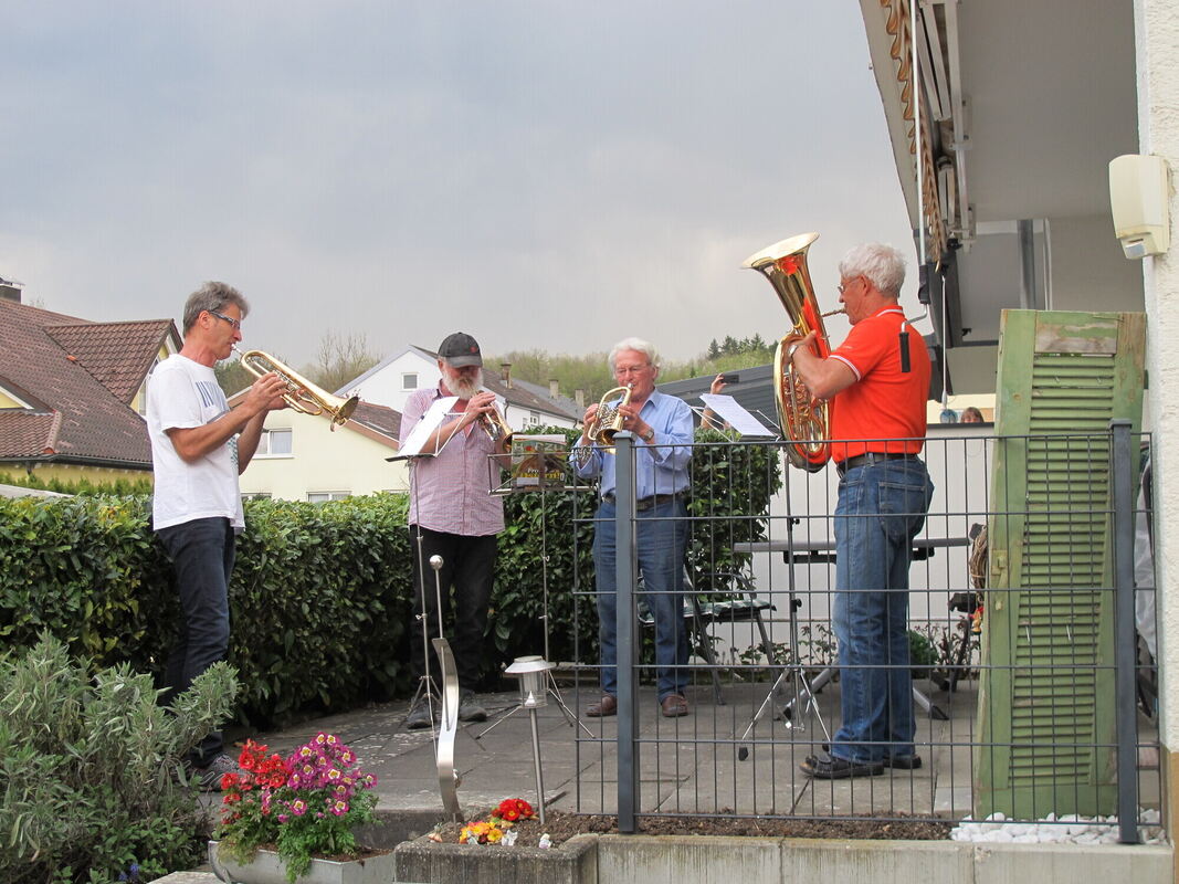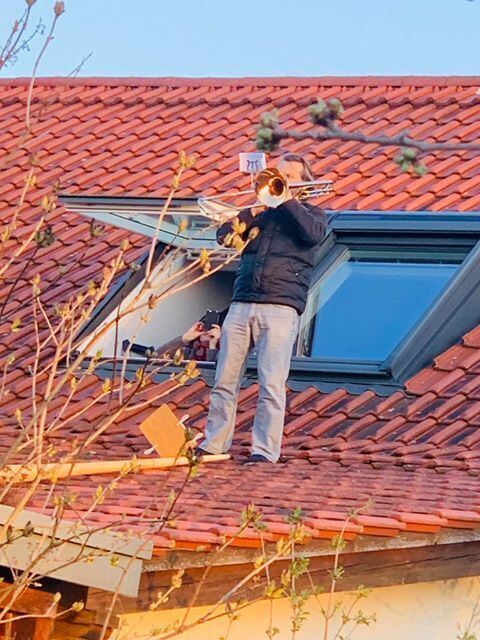 12:50 Uhr In Riederich war am Ostersonntag an vielen Stellen Open-Air-Musik zu vernehmen. Wie andernorts auch hatten sich Musiker in Familie und Bekanntenkreis zu kleinen Ensembles zusammengefunden, um unter dem Motto »Lieder, die verbinden« auf Balkonen und Terrassen zu spielen. Damit sollte auch in Riederich ein Zeichen des Zusammenhalts in Zeiten der Coronapandemie und der Kontaktbeschränkungen gesetzt werden. Die Europahymne »Freude schöner Götterfunken« aus Beethovens neunter Sinfonie erklang und wurde ergänzt durch die Melodien der Volkslieder »Die Gedanken sind frei«, »Keine schöner Land« und »Ade zur guten Nacht«. Egal wie perfekt gespielt wurde, der Applaus den Nachbarn war den Musikanten sicher. (GEA)