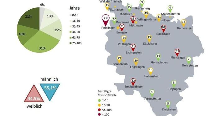 15:36 Uhr Die Zahl der Todesfälle im Zusammenhang mit Covid-19 ist im Kreis Reutlingen von 17 auf 19 gestiegen. Das mittlere Alter der Verstorbenen liegt bei 77,7 Jahren. Stand heute gibt es 1.114 Fälle bestätigte Corona-Fälle im Kreis Reutlingen. (ege)
