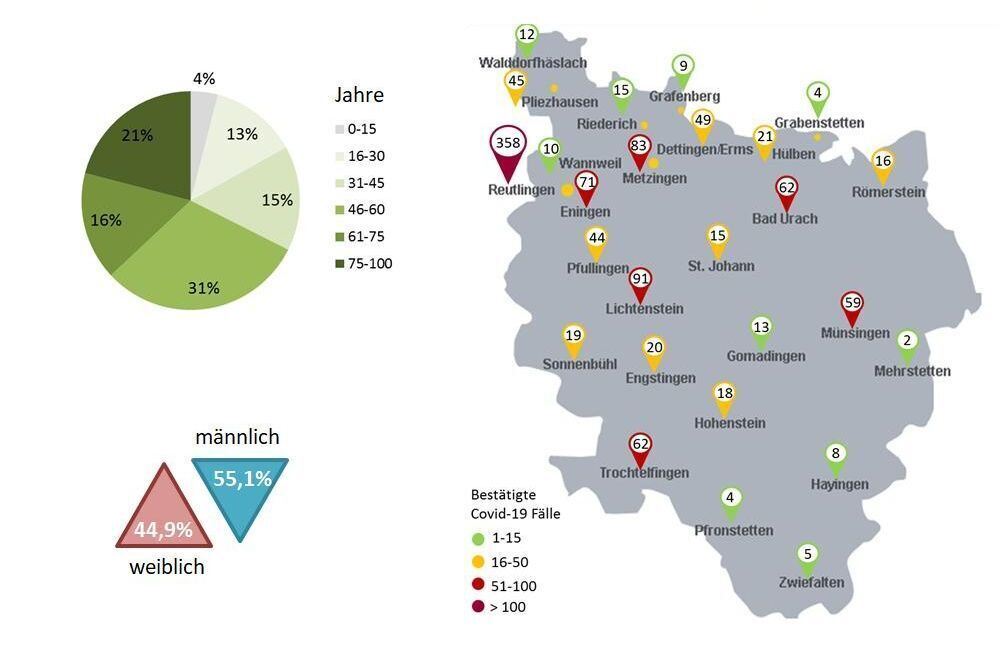 17:09 Uhr Aktuelle Corona-Zahlen für den Kreis Reutlingen: Wie das Landratsamt meldet, liegen 1.180 laborbestätigte Fälle und 27 Todesfälle vor. Damit stiegt die Zahl der Infizierten im Vergleich zu gestern um 22, die Zahl der Toten hat sich nicht verändert. 574 Personen gelten als genesen. Bislang wurden 7.273 Abstriche gemacht, begründete Verdachtsfälle gab es 3.609. (pm)