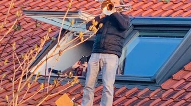 Trompeter Lukas Schult ist nicht nur musikalisch. 2019 wurde er zudem als Teil der Freien Wählervereinigung in den Eninger Gemeinderat gewählt. Außerdem sorgte er mit seinen Parodien über Jogi Löw immer wieder für Lacher. Eine Kostprobe von der WM 2018 finden Sie hier. Für Schult war ein tolles Erlebnis, mal in 20 Metern Höhe über seiner Heimatgemeinde zu schweben, sagt er dem GEA. Die Reaktionen der Menschen hätten ihn gefreut und auch berührt - »die haben glaub' ich auf irgendeine besondere Aktion in dieser Krise gewartet«. (pm/ege/kk)