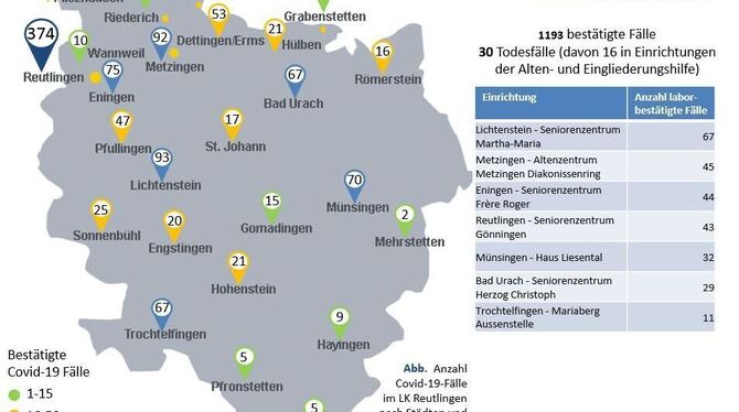 15:59 Uhr Im Landkreis Reutlingen gibt es aktuell 1.193 laborbestätigte Covid-19-Erkrankte und 30 Todesfälle. 609 Menschen sind bereits wieder genesen. Bislang wurden 7.899 Abstriche gemacht, begründete Verdachtsfälle gab es 3.638. Seit vergangener Woche werden Abstriche bei sämtlichen Bewohnern und Mitarbeitern aller 38 stationären Pflegeeinrichtungen im Landkreis Reutlingen gemacht, sagte Landrat Thomas Reumann am Dienstag bei einer Pressekonferenz. Bislang lägen zwar noch nicht alle Ergebnisse vor, der Zwischenstand von heute zeigt jedoch, dass diese Menschen ein besonderes Risiko tragen, am Coronavirus zu sterben. Von den 1.194 Corona-Fällen im Kreis entfallen 271 Bewohner von Einrichtungen der Alten- und Eingliederungshilfe. Das sind etwa 23 Prozent aller laborbestätigten Fälle. Von diesen 271 Personen sind bereits 16 gestorben, das sind knapp mehr als 50 Prozent aller Todesfälle im Zusammenhang mit Covid-19 im Kreis Reutlingen. (ege)