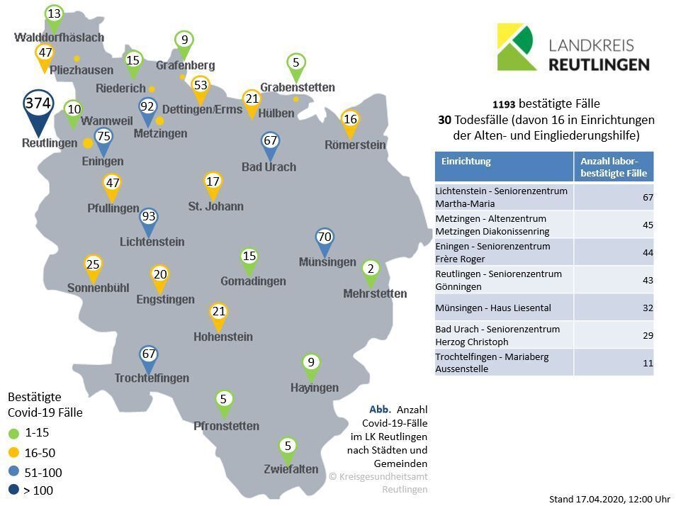 13:06 Uhr Im Landkreis Reutlingen liegen mittlerweile 1.004 bestätigte Corona-Fälle vor. 17 Menschen sind im Zusammenhang mit Covid-19 gestorben, meldet das Reutlinger Landratsamt. 444 Personen gelten als genesen. Insgesamt wurden Stand heute 5.524 Abstriche durchgeführt, außerdem wurden 3.473 Verdachtsfälle gemeldet. (pm)