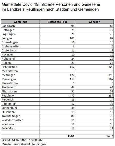 8:48 Uhr Das Reutlinger Landratsamt meldet, dass es seit Freitag einen neuen bestätigten Corona-Fall gibt. Damit gibt es im Kreis insgesamt 1.561 bestätigte Fälle. Die Zahl der Toten in Zusammenhang mit Covid-19 hat sich nicht erhöht, sie bleibt bei 89. Insgesamt 1.467 Personen gelten als genesen, das sind 99,66 Prozent (Todesfälle nicht eingerechnet). Damit sind aktuell noch fünf aktive Corona-Fälle bekannt. (pm)