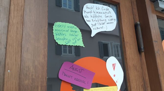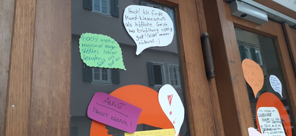 16:04 Uhr An den Eingangstüren des ehemaligen Löwen-Kinos können Passanten auf Sprechblasen schreiben, was sie durch die Corona-Pandemie gelernt haben. Das ist eine Aktion der AG Lebensstil und Solidarität, die Antworten werden gesammelt und im Netz veröffentlicht. (kk)