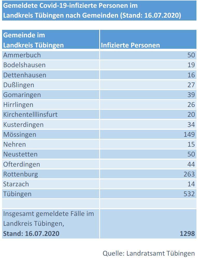 17:56 Uhr Erfreuliche Tagesmeldung aus dem Landratsamt Tübingen: die Fallzahlen sind im Kreis Tübingen auch über das Wochenende und am heutigen Montag nicht gestiegen. Es gibt weiterhin 1298 bekannte Corona-Fälle. Auch bei den Todesfällen ist kein Anstieg zu verzeichnen. (Stand 60 Todesfälle). (pm)