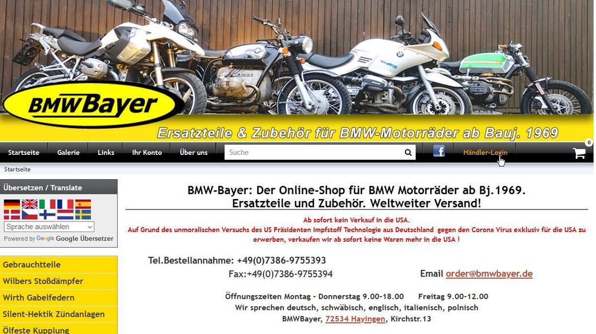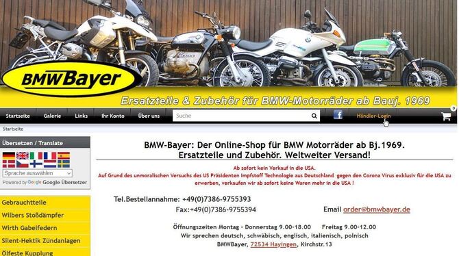 15:39 Uhr Das Hayinger Unternehmen BMW-Bayer, ein online-Shop für BMW-Motorräder, verkauft ab sofort keine Ersatzteile und Zubehör mehr in die USA. Der Grund: Donald Trumps Versuch, die wissenschaftlichen Erkenntnisse der Tübinger Firma Curevac, für die USA zu sichern. »Mir geht es um das Prinzip«, sagt Inhaber Georg Bayer.