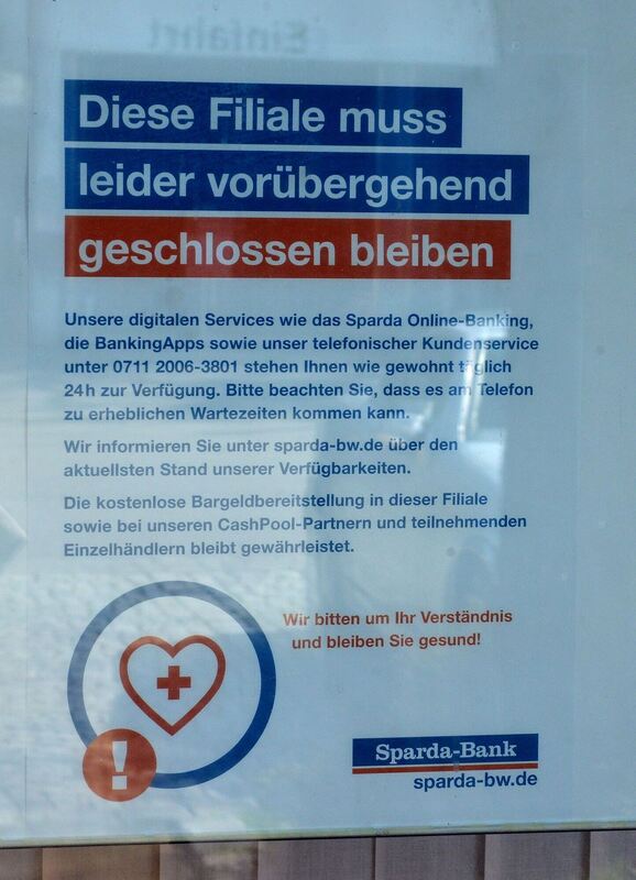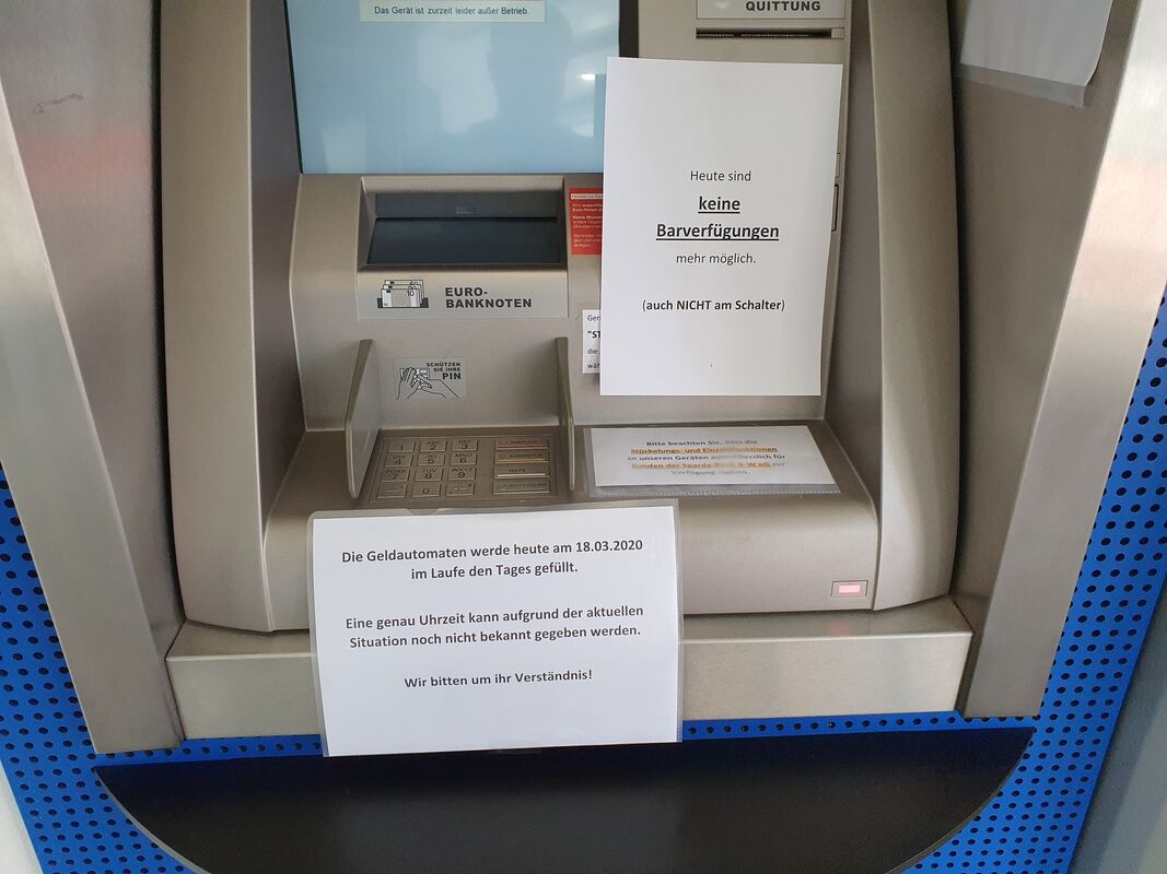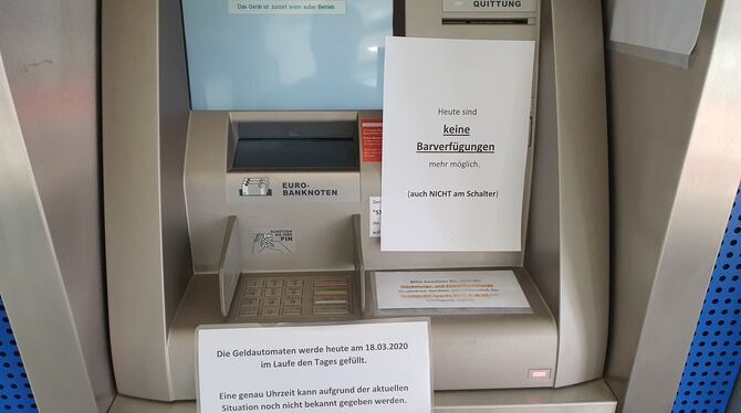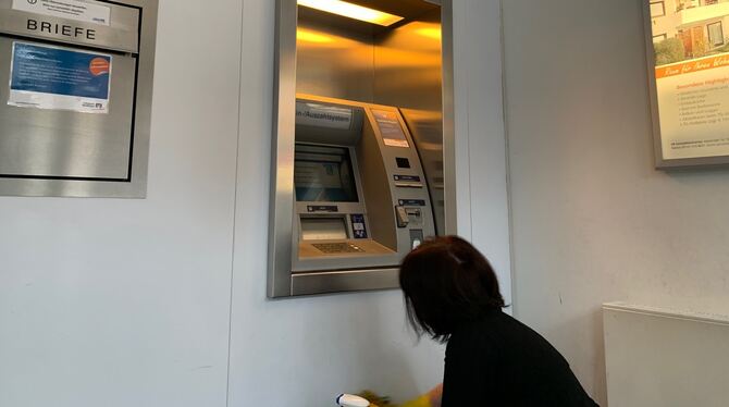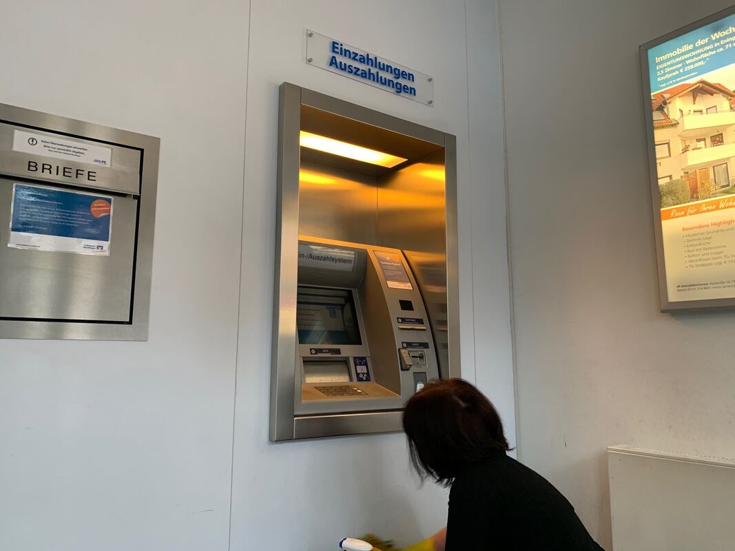 8:11 Uhr In der Volksbank-Filiale am Marktplatz riecht es nach Desinfektionsmittel. Eine Dame reinigt nicht nur sämtliche Geldautomaten sondergn gleich die ganze Wand. Schutz vor Infektionen wird auch hier großgeschrieben. (ege)