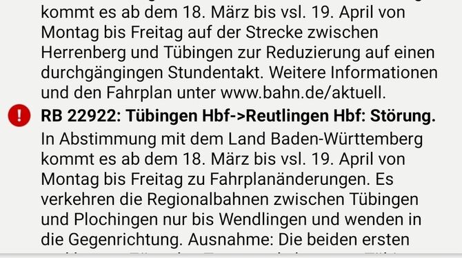 10:19 Uhr Die Corona-Lage im Land macht sich nun auch bei der Schwäbischen Alb-Bahn (SAB) bemerkbar. Sie hat einige Maßnahmen getroffen. Vorerst bleibt der Zugverkehr nach Fahrplan bestehen, aber für den Fall, dass sich die Situation verschlimmert, seien Notfahrpläne vorbereitet, teilte die SAB mit. (pm)