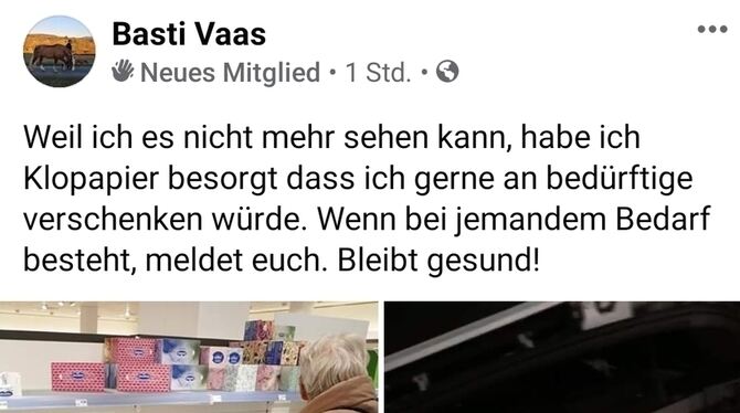 20:05 Uhr Über Klopapier haben wir in diesem Ticker schon viel geschrieben - aber noch nie über jemanden, der dieses doch so rare Gut verschenkt. In der Facebook-Gruppe »#Nachbarschaftschallenge Reutlingen« hat Basti Vaas ein Angebot gemacht, dass in Corona-Zeiten aufhochen lässt: Er verschenkt Klopapier an Bedürftige.
