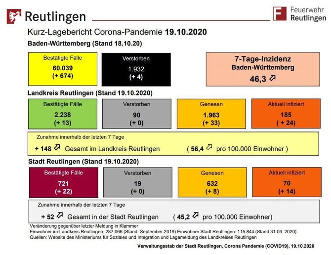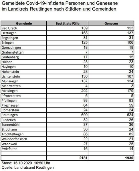 19:22 Uhr Das Reutlinger Landratsamt meldet für Dienstag 37 Neuinfektionen mit dem Coronavirus. Damit gibt es im Kreis insgesamt 2.275 bestätigte Fälle. Die 7-Tage-Inzidenz pro 100.000 Einwohner liegt bei 59,9. (pm)