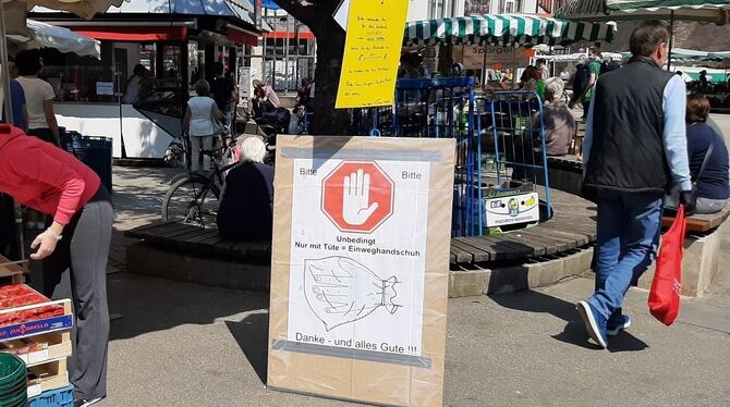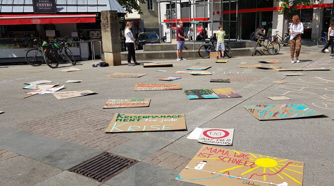 13:35 Uhr Die Klimakrise auch während der Coronakrise nicht aus den Augen verlieren – dafür plädiert die Reutlinger Gruppe der Fridays for Future. Da die Klimaschützer zurzeit keine Demonstrationen und Kundgebungen organisieren können, starteten sie heute zur Mittagszeit eine Plakataktion auf dem Marktplatz. Eine Stunde lang präsentierten sie selbst gemalte und beschriftete Plakate, die an den Klimawandel und die vielfältigen damit einhergehenden Probleme erinnerten. »Wir wollen auch auf unsere Aktivitäten im Netz aufmerksam machen und zum Mitmachen aufrufen«, sagte Ricarda Schneider vom Orga-Team der Fridays for Future. Sie erklärte, wie »der Netz-Streik« aussieht: »Man macht ein Foto von sich mit einem Demo-Plakat und postet es auf einem sozialen Netzwerk mit #netzstreikfürsklima.« (ele)